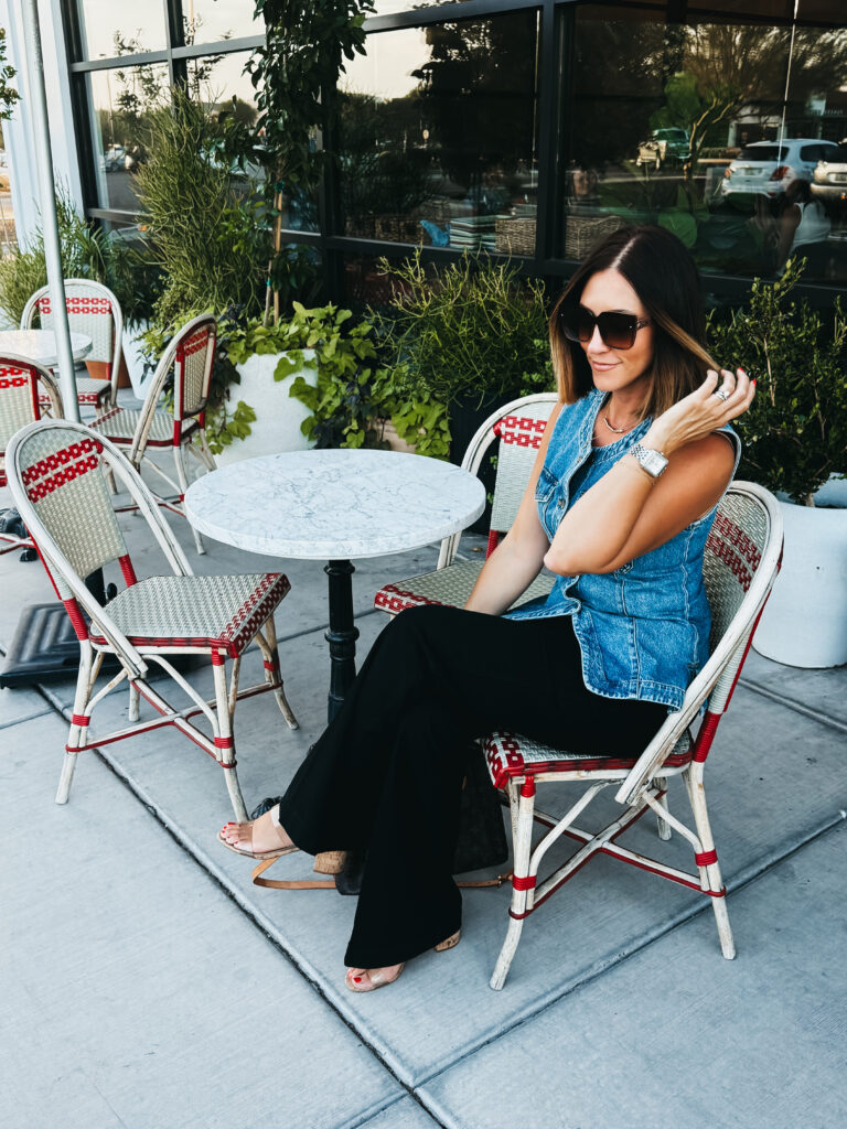 This vest is part of a set with shorts, but I love wearing it with jeans! I’m in a small in the vest and a size 27 in the jeans.