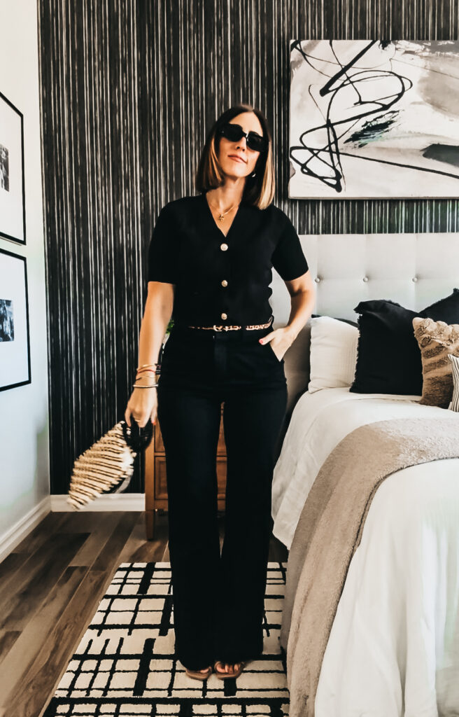 black denim flare trousers // short sleeve cardigan // beaded purse // leopard belt // nude heels